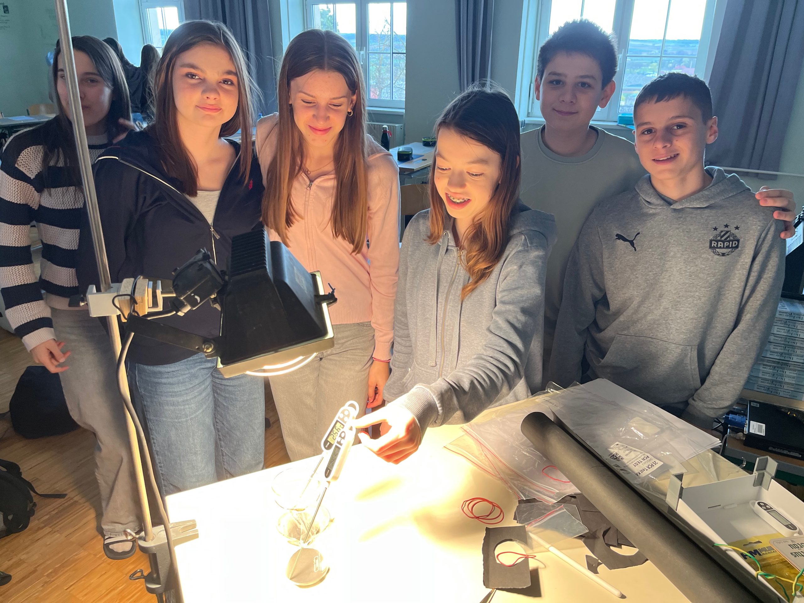- Elektrizität: Hier werden grundlegende Konzepte wie Spannung, Stromstärke und Widerstand praktisch angewendet. Die Schüler:innen beschäftigen sich mit Serien- und Parallelschaltungen, elektronischen Bauteilen und erlernen das Löten von Platinen.